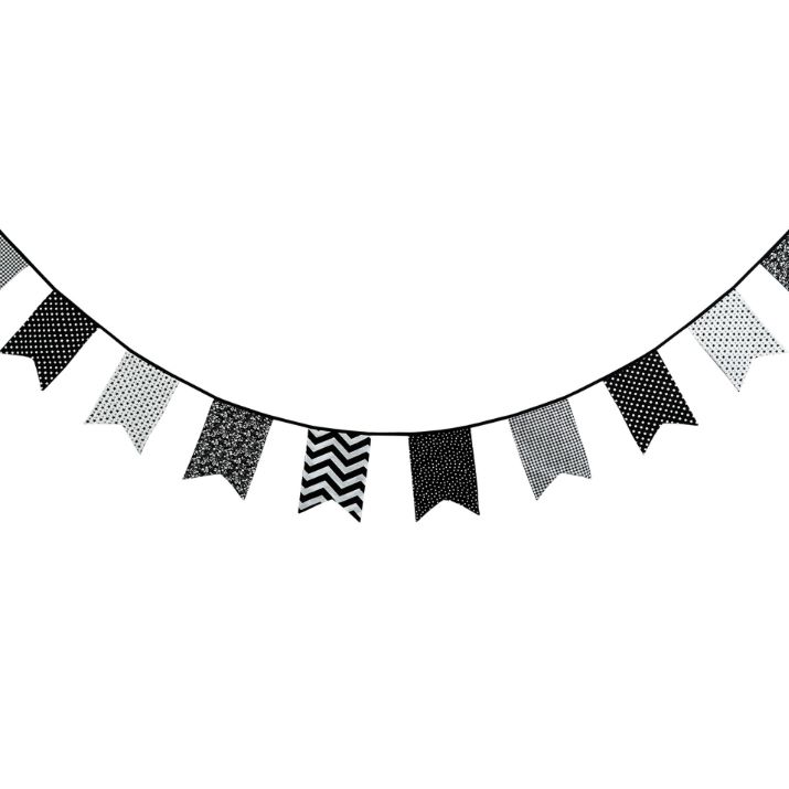 Гирлянда состоит из 12 флажков, общая длина составляет 3,4 м, расстояние между флажками 3 см, длина матерчатых флажков 2,1 м, длина лямок с обеих сторон по 50 см