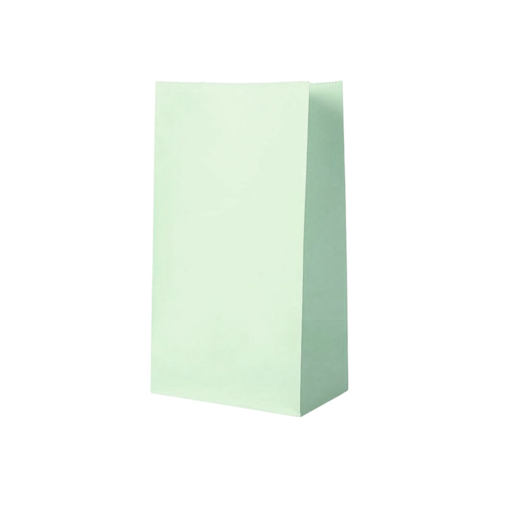 Подарочный пакет из крафтовой бумаги пастельного оттенка с белыми бумажными ручками и белой внутренней стороной.