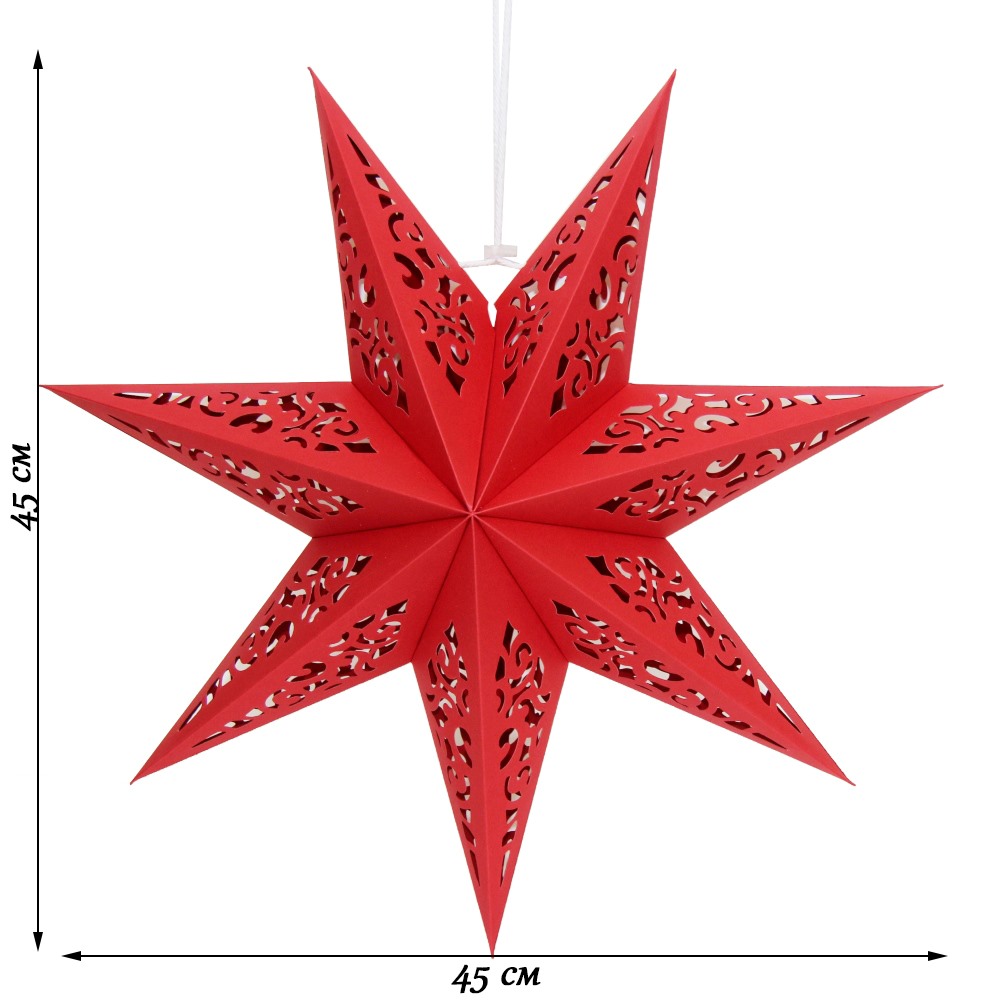 Семиконечная объемная звезда 45 см — великолепный декор из тонкого перфорированного картона. Создает красивые световые эффекты. Поставляется в сложенном виде, в комплекте шнур для фиксации объема и подвеса.
