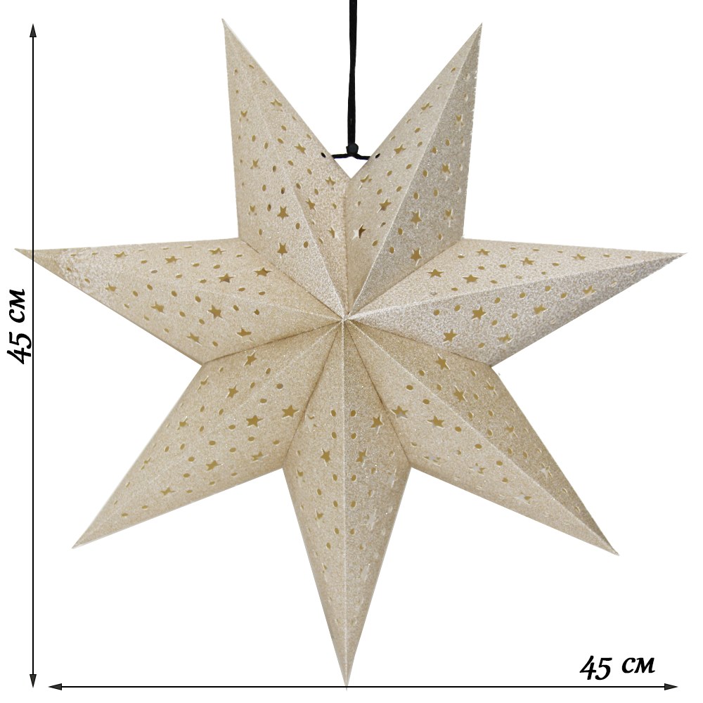 Семиконечная объемная звезда 45 см — великолепный декор из тонкого перфорированного картона с золотыми блестками. Создает красивые световые эффекты. Поставляется в сложенном виде, в комплекте шнур для фиксации объема и подвеса.